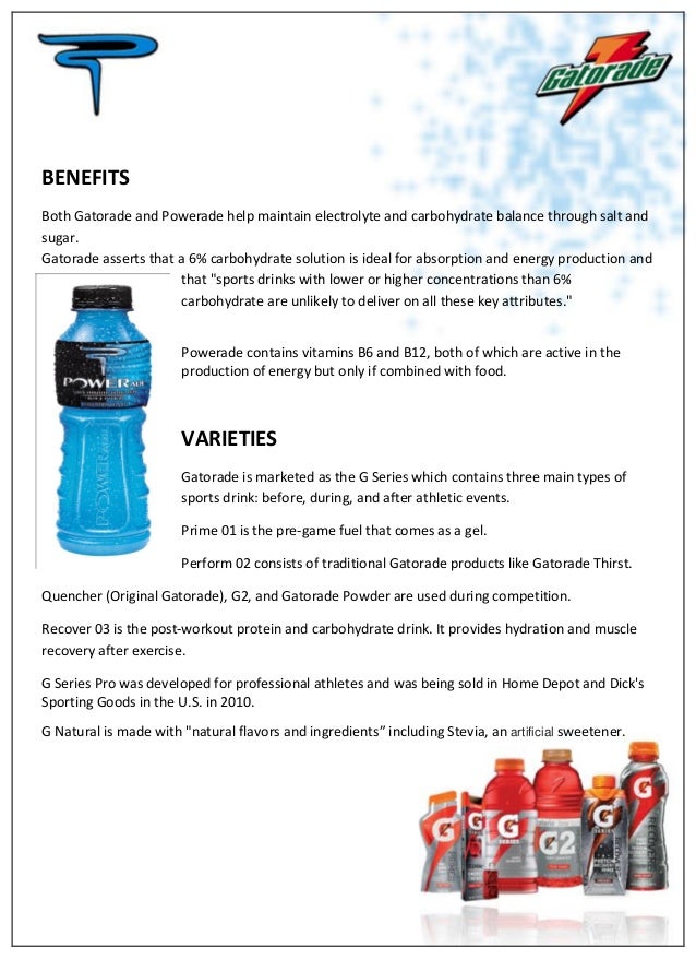 Powerade vs. Gatorade: What's the Difference? - Healthline Powerade and Gatorade are sports drinks that come in a variety of flavors and are made with different ingredients. Different sweeteners The main ingredients in both Powerade and Gatorade are water,...