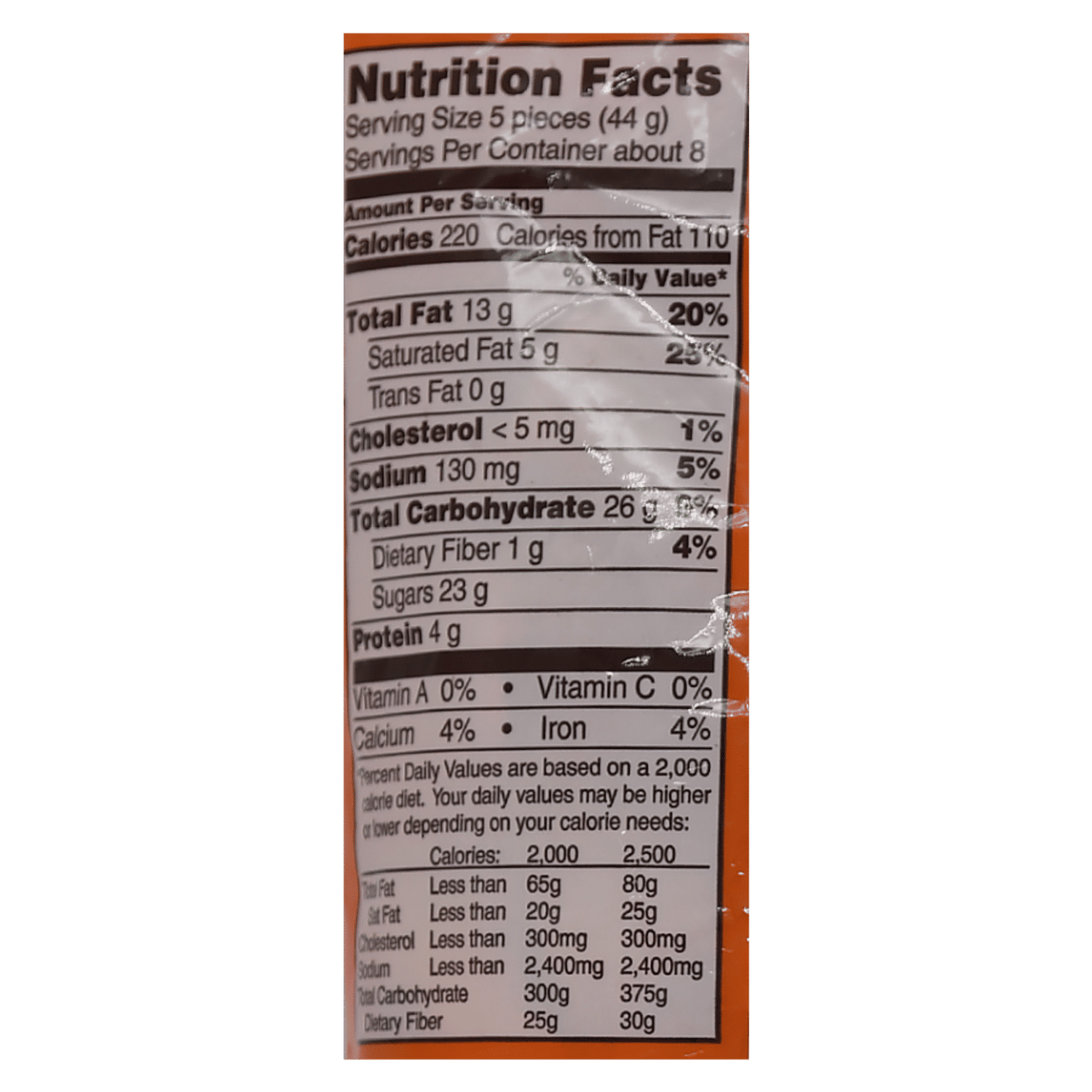REESE'S - Peanut Butter Cups - SmartLabel™ REESE'S - Peanut Butter Cups - SmartLabel™ Peanut Butter Cups 220 Calories 4.5 Sat Fat (g) 150 Sodium (mg) 22 Sugars (g) Nutrition Facts 1 servings per container Serving Size 1 package (42g) Amount per serving Calories 220 % Daily Value* Total Fat 13g 20% Saturated Fat 4.5g 23% Trans Fat 0g Cholesterol <5mg 1% Sodium 150mg 6% Total Carbohydrate 24g