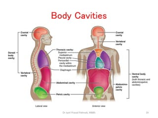 PDF Chap1-anatomical terminology [Compatibility - Los Angeles Mission College Body organization 1. Body cavities - hollow spaces within the human body that contain internal organs. a) The dorsal cavity: located toward the back of the body, is divided into the cranial cavity (which holds the brain) and vertebral or spinal cavity (which holds the spinal cord). b) The ventral cavity: located toward the front of the body, is