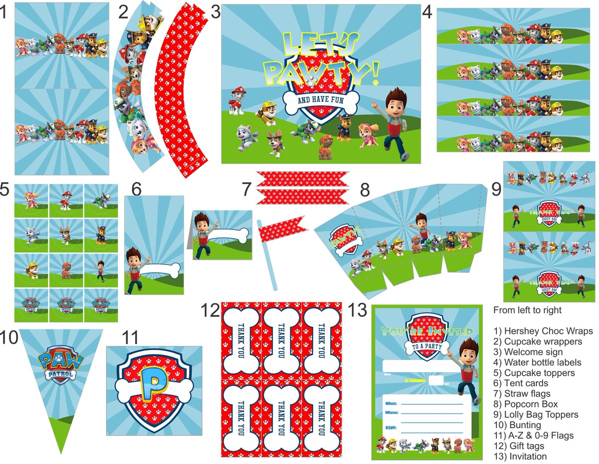 Paw Patrol Party Printables - Party with Unicorns FREE Paw Patrol Party Package. What is included in the Paw Patrol freebie printable package: 1) CUPCAKE TOPPERS. 2) WATER BOTTLE WRAPPERS. 3) FOOD LABELS. 4) THANK YOU TAGS. 5) NAPKIN RINGS. 6) BANNER. 7) CUPCAKE WRAPPERS.