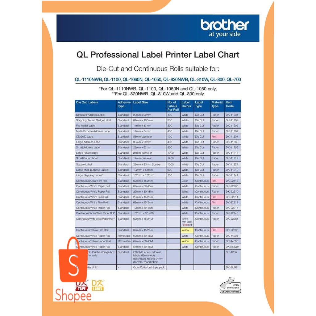 Brother Tapes and Labels | Supplies | Brother UK Brother's paper adhesive labels provide an efficient way of producing address and mailing labels. They are also perfect for file identification, folders, cabinets and shelves. Labels can be printed 62mm to 102 mm in width and can be cut to a bespoke size where special requirements dictate. There are also a wide variety of pre-cut sizes. Brother DK Label - Label Supply - EZselection Brother currently offers low cost paper labels, durable film and removable labels in various widths on die-cut (pre-sized) and continuous drop-in label and tape rolls. Brother Die-Cut DK Labels: Brother offers die-cut (pre-sized) drop-in label rolls for your convenience. PDF Professional Label Guide - Brother Standard 103mm x 30m - Continuous Paper DK-22246 ABC Black / Red on white Continuous White Paper Roll 3Standard 62mm x 15.24m - Continuous Paper DK-22251 ABCBlack on yellow Continuous Yellow Film Roll Standard 62mm x 15.24m - Continuous Film DK-22606 ABCBlack on white Continuous White Paper Roll Removable 62mm x 30.48m - Continuous Paper DK-44205 Label Tape & Rolls | Brother Australia When it comes to labelling, flexibility matters. That's why both TZe label tapes and DK label rolls are compatible with a wide range of label printers & makers for the complete gamut of labelling needs. DK label rolls QL range: Desktop thermal printers ranging from 62mm to 104mm in size. TZe label tapes
