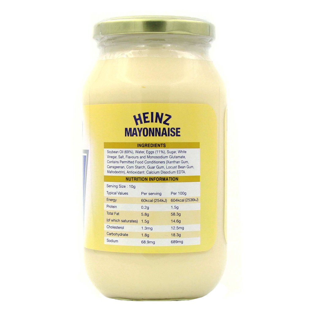 The Best & Worst Mayonnaise Brands, Ranked — Eat This Not That Heinz Real Mayonnaise. PER 1 TBSP: 100 calories, 11 g fat (1.5 g saturated fat), 80 mg sodium, 0 g carbs (0 g fiber, 0 g sugar), 0 g protein. Ingredients: Soybean Oil, Whole Eggs and Egg Yolks, Distilled White Vinegar, Water, Salt, Sugar, Natural Flavor (Contains Mustard), Lemon Juice Concentrate, Calcium Disodium EDTA.