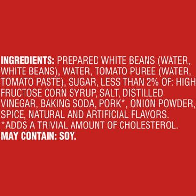 Van Camp's Pork and Beans in Tomato Sauce, Van Camp's, Pork and Beans ... PREPARED WHITE BEANS (WATER, WHITE BEANS), WATER, TOMATO PUREE (WATER, TOMATO PASTE), SUGAR, LESS THAN 2% OF: HIGH FRUCTOSE CORN SYRUP, SALT, DISTILLED VINEGAR, PORK, BAKING SODA, ONION POWDER, NATURAL AND ARTIFICIAL FLAVORS, SPICE, CALCIUM CHLORIDE (A FIRMING AGENT). Product Images
