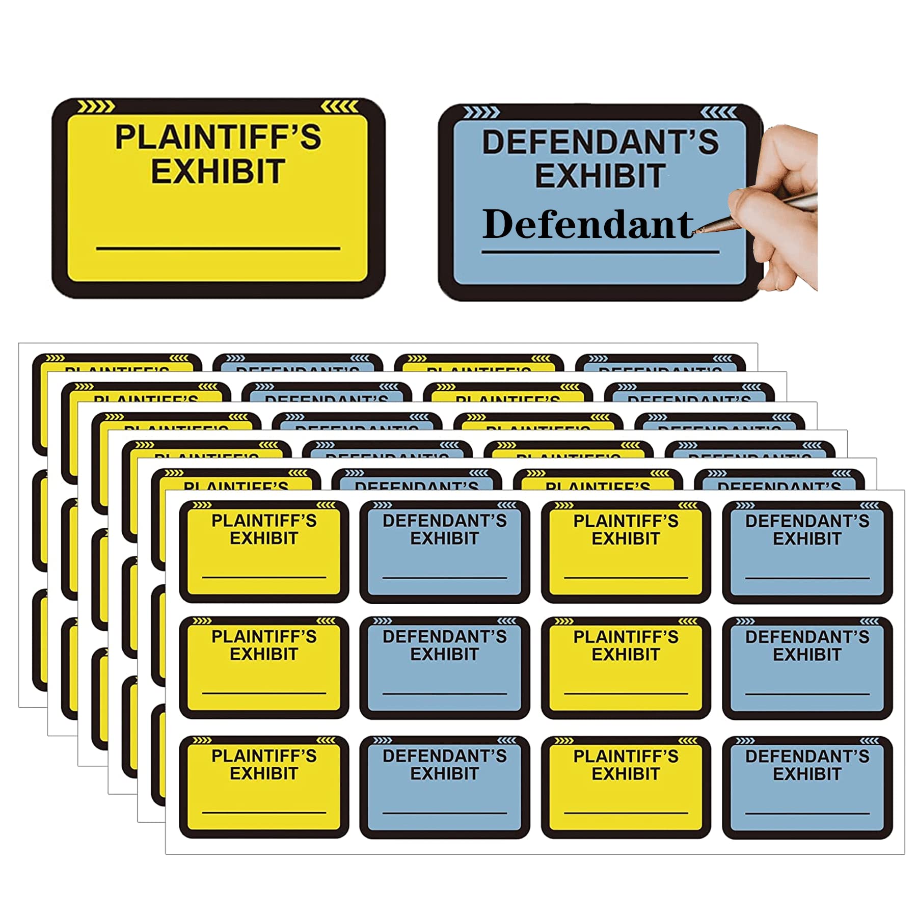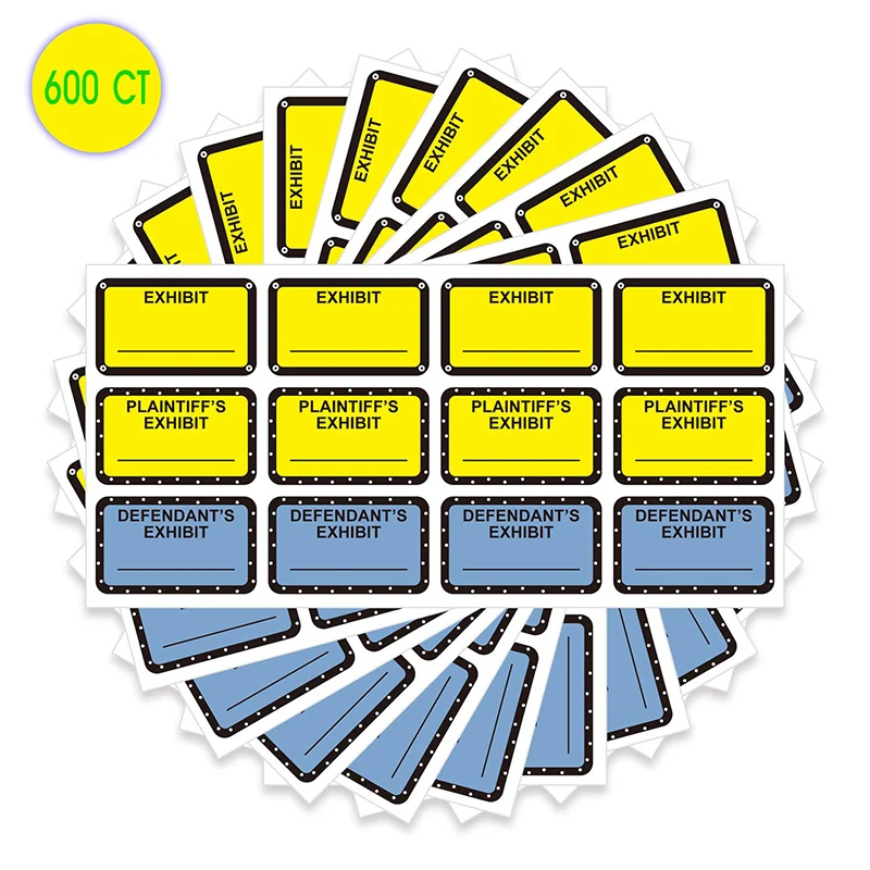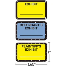 Amazon.com: Defendant Exhibit Stickers 1"x2" 500 PCS Exhibit Stickers Plaintiff's Exhibit Defendant's Exhibit Petitioner's Exhibit Respondent's Exhibit Legal Exhibit Labels-Poskornwel. 4.5 out of 5 stars 29. $9.99 $ 9. 99. FREE delivery Mon, Jan 30 on $25 of items shipped by Amazon. Or fastest delivery Fri, Jan 27 . Tabbies Exhibit Labels & Stickers | LegalSupply Tabbies exhibit stickers are perfect for labeling your legal documents. Place these colorful exhibit stickers on court documents, case files, letters, photos, and depositions, to make referencing your exhibits a breeze. Tabbies brand exhibit labels are trusted by legal professionals nationwide.