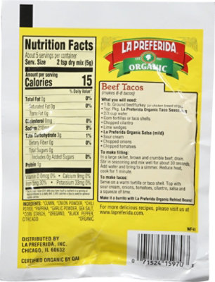 Easy Taco Seasoning Recipe - NatashasKitchen.com *Nutrition label is calculated per 1 teaspoon of homemade taco seasoning. Nutrition Facts Homemade Taco Seasoning Recipe Amount Per Serving Calories 7 Calories from Fat 3 % Daily Value* Fat 0.3g 0% Saturated Fat 0.04g 0% Polyunsaturated Fat 0.1g Monounsaturated Fat 0.1g Sodium 274mg 12% Potassium 38mg 1% Carbohydrates 1g 0% Fiber 1g 4% TACO SEASONING NUTRITION LABEL RECIPES All You Need is Food Nutrition Facts : ServingSize 1 scant cup, Calories 220 kcal, CarbohydrateContent 28 g, ProteinContent 21 g, FatContent 3 g, CholesterolContent 44 mg, SodiumContent 729 mg, FiberContent 8.5 g, SugarContent 6 g OLD EL PASO TACO SEASONING MIX ORIGINAL 6.25OZ : TARGET