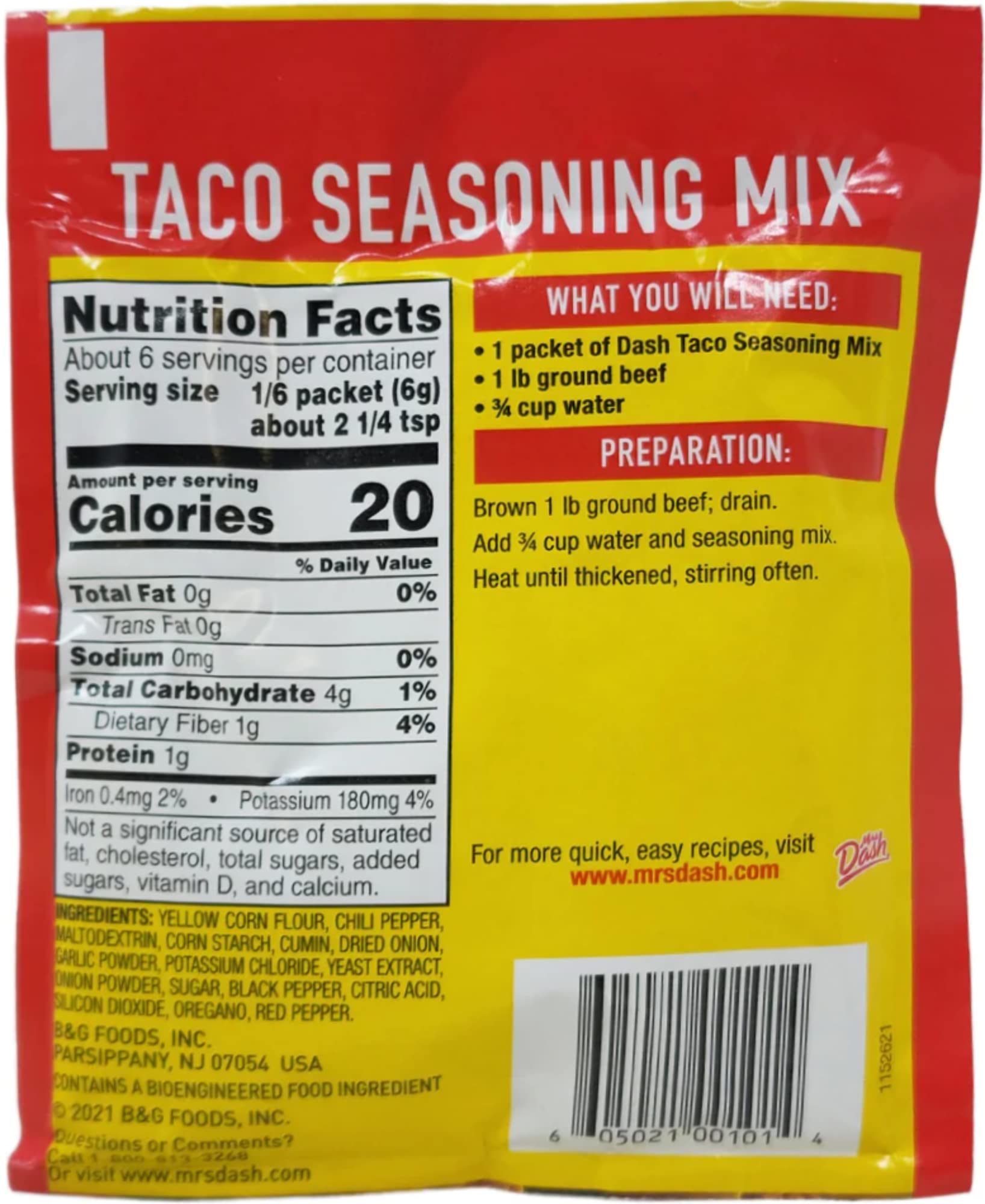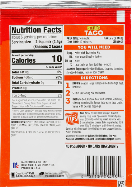 Sugar-Free Keto Taco Seasoning Mix - KETOGASM McCormick Original Taco Seasoning Mix nutrition label lists 3g carbs per serving. Many incorrectly assume a serving size is an entire packet, but the label specifies there are 6 servings per 1-ounce packet. This yields a whopping 18 grams of carbohydrate per packet. 3g carbs x 6 servings = 18g carbs Taco Bell Nutrition Information Contact restaurant for prices, hours & participation, which vary. Tax extra. 2,000 calories a day used for general nutrition advice, but calorie needs vary. Additional nutrition information available upon request. ⚠ WARNING : Certain foods and beverages sold or served here can expose you to chemicals including acrylamide in many fried or ... Taco Seasoning - Premium Spices - Vanns Spices Taco Seasoning A traditionally flavored and well-balanced blend. Vanns taco seasoning makes a terrific, thick sauce for tacos. Add 4 tsp. to 1 lb. of ground beef to make about 12 tacos. Top Flavors Spicy, robust Delicious In Tacos, Tex-Mex You should also try All Spices