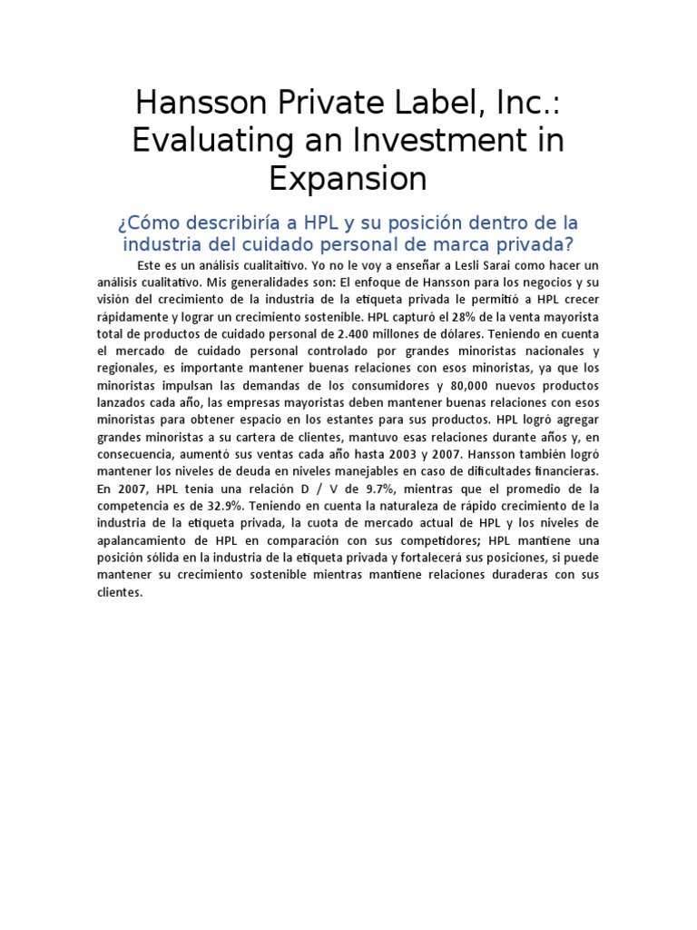 Hansson Private Label, Inc. by Michael Wang - Prezi Hansson Private Label, Inc. Evaluating an Investment in Expansion by Qing Wang, Xue Sun, & Zhonghao Wang Target of Hansson and Its Position in the Industry Conclusion SWOT Analysis Positive NPV? Revenue Gross Operating Profit Net Income Revenue Growth Margin Private Label Get started for FREEContinue Prezi The Science Conversational Presenting Hansson Private Label Case Study | Case Study Template Company Background and Performance Analysis The Hansson Private Label (HIP), started In 1992 when Tucker Hansson bought over company that manufactures personal hygiene products Including soap, shampoo, sunscreen, mouthwash, and shaving cream (Stafford, Helping, and Devolved, 2010). Hansson Private Label HBS Brief Case 4021 Case Study Case Study. Hansson is faced with the decision of whether or not to pursue a $50 million expansion. The decision is risky. It concentrates the firm's business with a single major customer, and that customer is only willing to sign a three-year guaranteed contract. Hansson has built a successful business as a supplier of private-label personal ... Hansson Private Label, Inc.: Evaluating an Investment in Expansion ... Hansson Private Label, Inc.: Evaluating an Investment in Expansion By: Erik Stafford, Joel L. Heilprin, Jeffrey DeVolder A manufacturer of private-label personal care products must decide whether to fund an unprecedented expansion of manufacturing capacity. The decision prompts fundamental financial analysis of the… Length: 11 page (s)