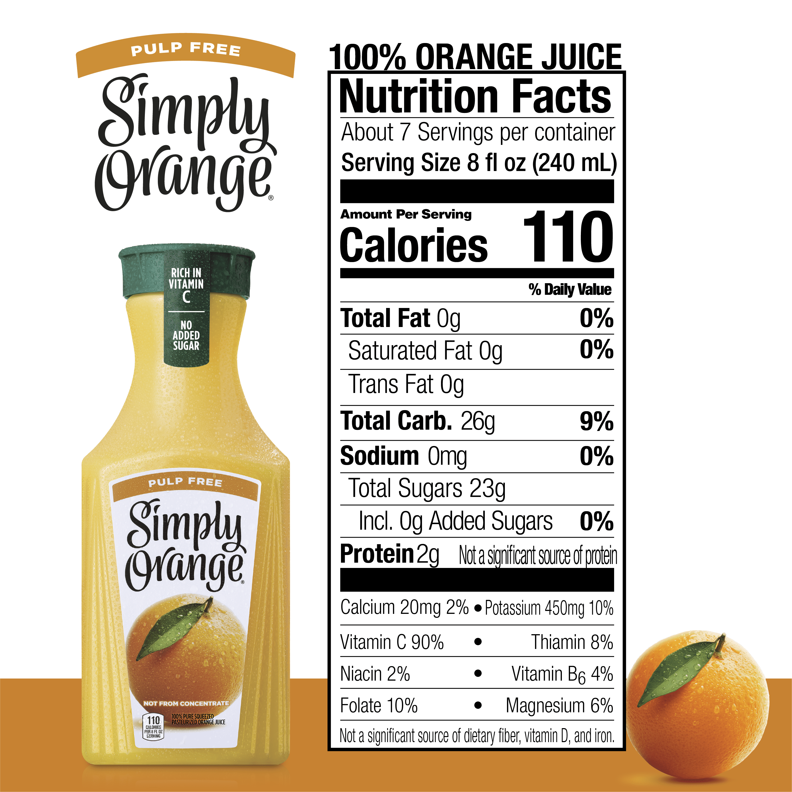Orange juice by SIMPLY ORANGE - Nutritional Value Orange juice by SIMPLY ORANGE contains 110 calories per 240 g serving. This serving contains 0 g of fat, 2 g of protein and 26 g of carbohydrate. The latter is ... Simply Orange Juice with Calcium Pulp Free - Giant Food 110 calories per 8 fl oz serving. Rich in vitamin C. No added sugar. Calcium. Vitamin D. Good source of vitamin C, vitamin D & calcium. No added sugar (Not ... Orange Juice (Pulp Free) - Nutrition Facts - FatSecret Sep 21, 2020 ... There are 110 calories in 1 cup (8 oz) of Simply Orange Orange Juice (Pulp Free). Nutrition Facts. Serving Size, 1 cup (8 oz) ...